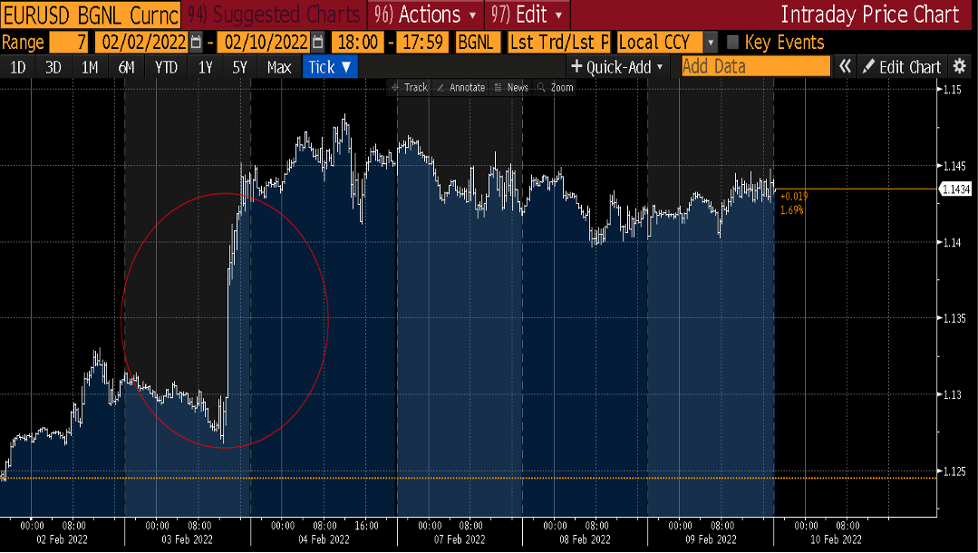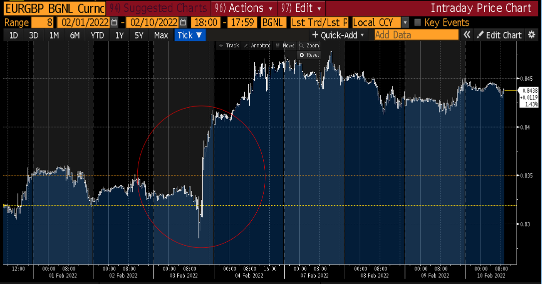 Post the Bank of England it was the turn of the ECB to take centre stage with their rate announcement on Thursday– with the market’s expectations firmly in the camp that Lagarde would stick to her mantra – ‘’no change, playing a straight bat, let’s see how things are in March at the next meeting when we will have the new economic projections from the ECB economists’’. Well, that was a mistake, as the ECB went from never hiking interest rates and Euro being the perennial funder, to Lagarde sighting inflation as a real concern in her press conference and opening the door to future rate hikes. This is a huge pivot for the ECB, which occupied the most dovish central bank category along with the SNB and the BOJ. Markets immediately began to price in rate hikes this year and the Euro rallied hard versus most currencies – in particularly the Dollar and Sterling. See chart of EUR/USD and EUR/GBP below – The market is now pricing in up to 35 bps of interest rate hikes into Dec 2022 – if this was to increase, we could see a significant move in the Euro across the board…. Watch this space.