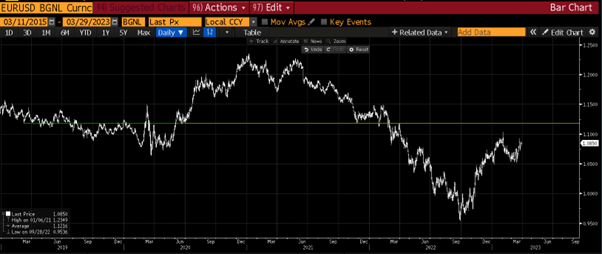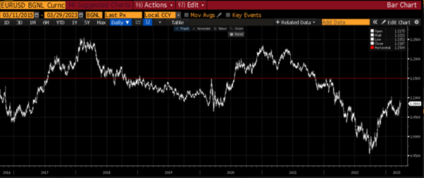 The Euro recovered some 15% versus the Dollar up to the beginning of Feb this year, as the ECB begin its interest rate hiking cycle and recession fears hit the States. Feb’s economic releases out of the US however once again turned everything on its head – inflation stopped falling, the economic survey and sentiment indicators all turned positive and Feb’s employment report was a monster release.